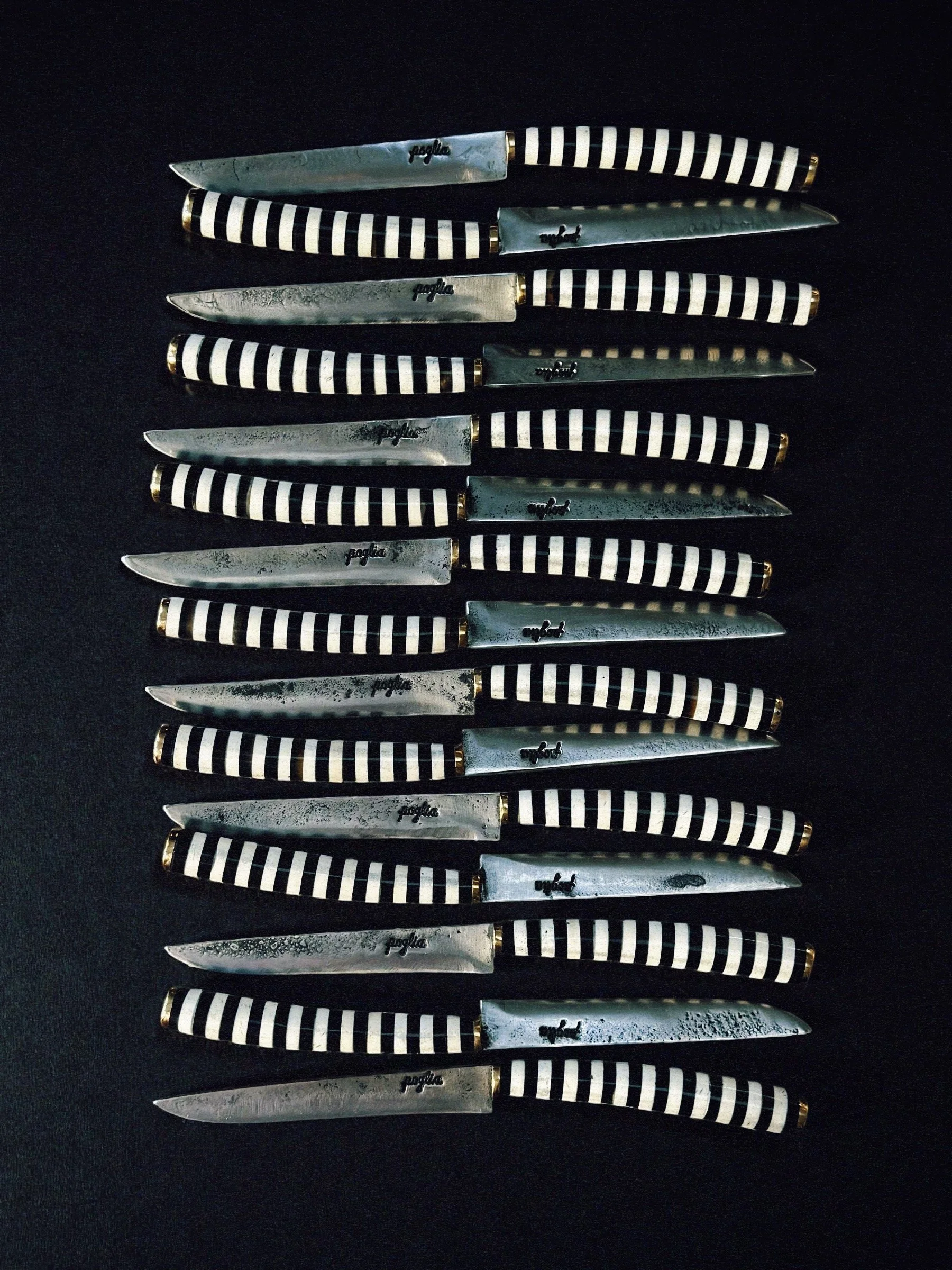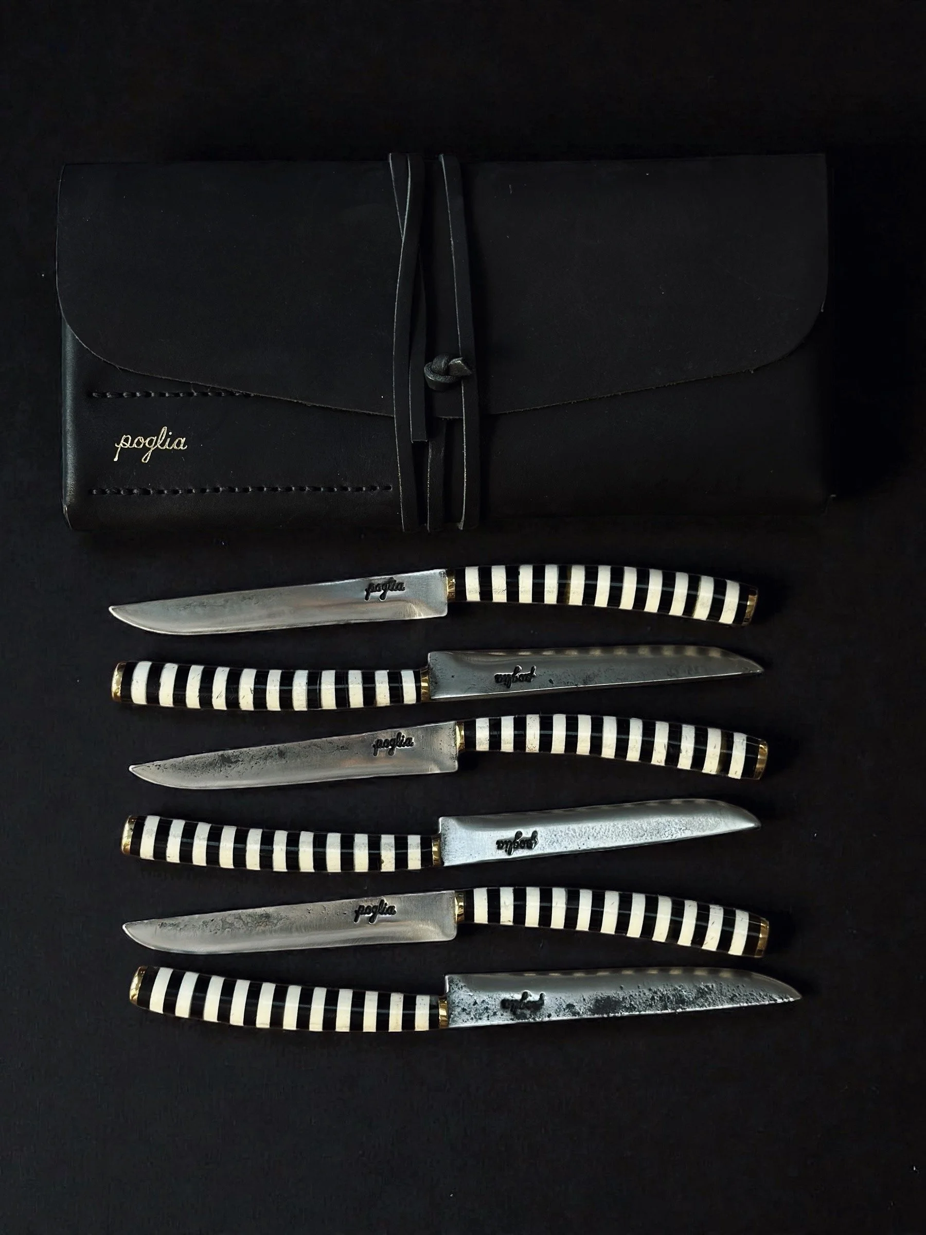No two Poglia knives are the same. Each blade is hand-drawn and forged from repurposed steel, and cut mostly from reclaimed plow disks; This is our signature. Everything is done the old-school way. Poglia knives are handled by eight hands, from the initial design to the final polish. The utility knives come in a trim leather sheath.